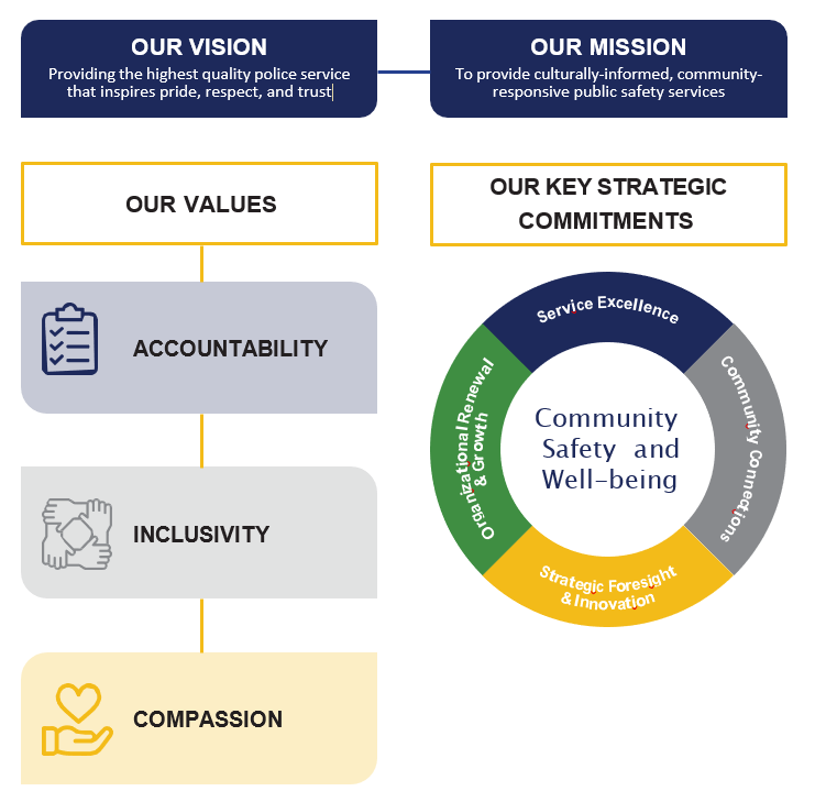 The plan addresses the priorities expressed by the community and aligns these with the priorities of the Board and the Department under Chief Duthie’s leadership. The plan outlines our key strategic objective of community safety and well-being by providing service excellence through community connections, using strategic foresight and innovation, while ensuring organizational resilience and growth of the Department to serve our community. We recognize the needs of all Department staff for a respectful workplace, work-life balance, and support as they face stressful situations.